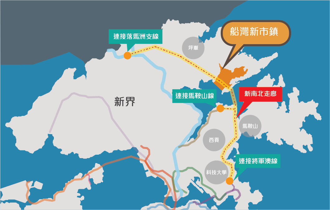 A conceptual railway network development to strengthen the N-S traffic by connecting the Tseung Kwan O Line with Lok Ma Chau Spur Line in the eastern territories through Sai Kung and Ma On Shan.
