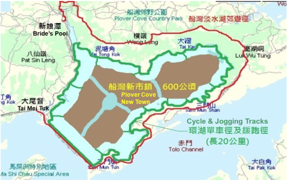 A preliminary land use planning showing how the surrounding country park is kept intact without adverse effect due to the establishment of the Plover Cove New Town in the reservoir